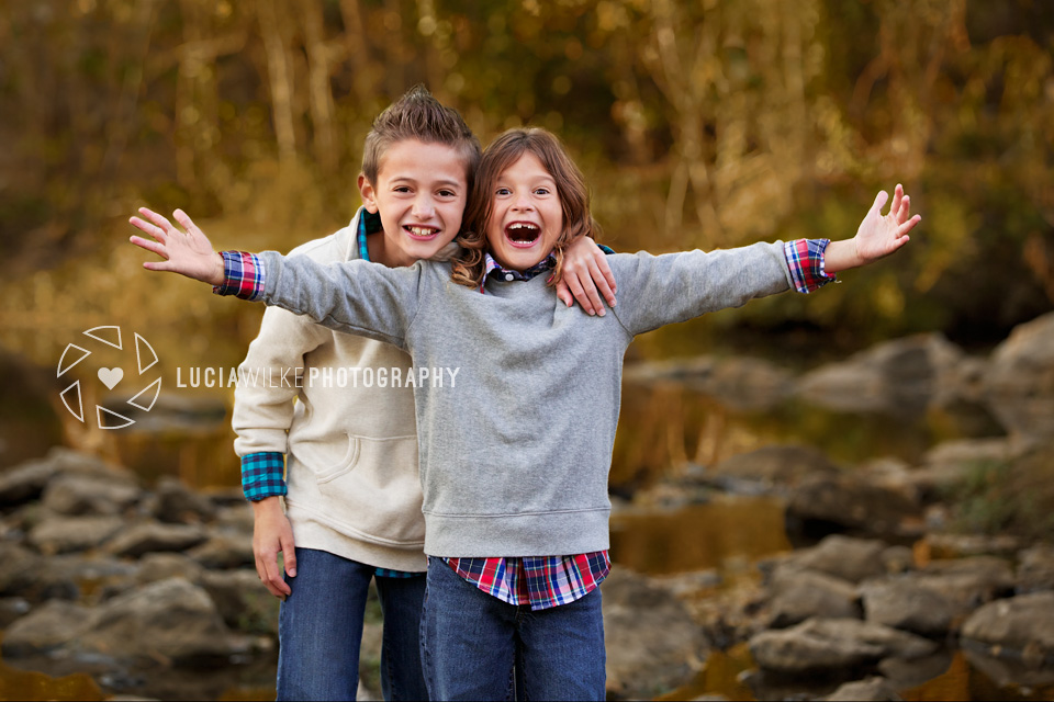 As the mom of three girls, I am always interested in doing boy/brother portraits. I love the chance to see how different (or the same) they are to girls/sisters. These two truly represented the craziness that is “boy.” I really have been looking forward to our session because I knew they’d be up for the challenge of getting to our location — a creek that runs through a city park. For most people, the creek is not easy to climb down to. Of course, the boys had no problem. Thankfully no one fell in the water!